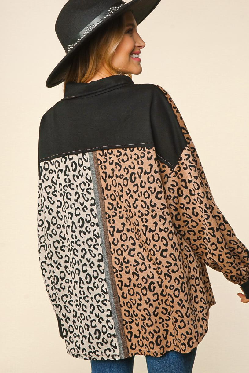 LEOPARD ANIMAL JACQUARD KNIT AND SOLID FRENCH TERRY COLOR BLOCK COLLAR BUTTON DOWN BUBBLE LONG SLEEVE LOOSE FIT OVERSIZED PULLOVER KNIT TOP WITH RAW EDGE DETAIL AND POCKETS
