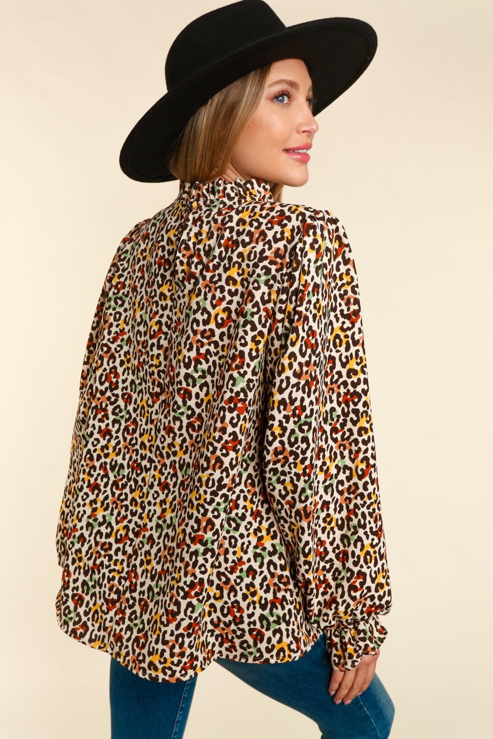 FRILLED MOCK NECK WITH BUTTON LEOPARD ANIMAL PRINT BUBBLE LONG SLEEVE WITH RUFFLE HEM WOVEN BLOUSE TOP